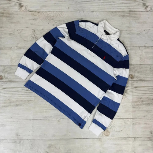 Vintage Polo Rugby Shirt Long Sleeve Striped Men Blue