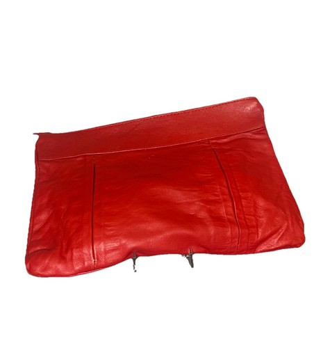 The handbag is crafted with a matte finish and lined with vinyl in a coordinating red color.