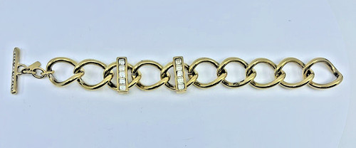 This vintage Monet bracelet is a true gem. The chunky gold tone toggle design is adorned with princess cut stones that add a touch of elegance to any outfit. The bracelet is 8 inches in length and features a chain style closure. The brand is well-known for its high-quality jewelry, and this piece is no exception. The base metal and metal type are unknown, but the item is sure to last for years to come. Perfect for those who love vintage and antique jewelry, this bracelet is a must-have addition to any collection. There is some slight discoloration in goldtone on the link chains, but nothing drastic. Please look at all photographs. Thanks so much.