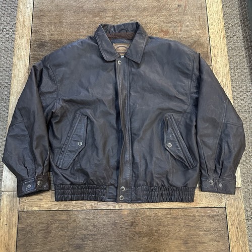 This VTG St Johns Bay Leather Jacket in Men's XL size is a classic and retro-style bomber jacket that is perfect for casual occasions. Made from leather with a polyester lining, it features a solid brown color and a spread collar design. The jacket has a zip closure, pockets, and is designed for winter, fall, and spring seasons. The vintage St. John's Bay brand adds a touch of nature and outdoor-inspired style to your wardrobe. Perfect for walking and everyday wear, this jacket exudes a timeless and rugged charm.
