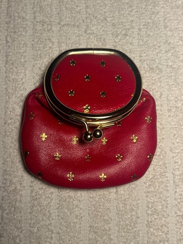Red Fleur de Lis patterned Change Purse. Round Kiss Lock Top (photo). Mirror inside Top (photo). Genuine Leather (photo).