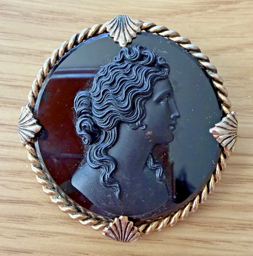 Vintage cameo style brooch featuring a classical lady profile in black with a gold tone rope and shell design frame. Details: • Size: approx 2.25” • Weight: 43.16 grams • Closure: pin back Condition: • Good vintage condition • Light surface wear consistent with age • No major damage