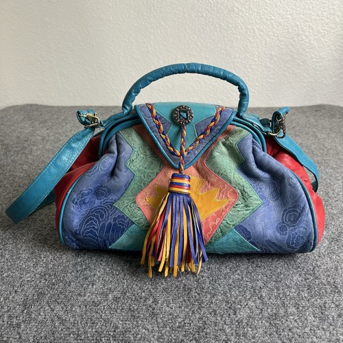 Vintage VIVA of California Color Block Fiesta Leather Handbag Purse. See all pics because it has some flaws as seen like some distressing from age. Also stains are present/scuff marks. The leather shows some fading and scuff marks as seen. By no means is this handbag in perfect shape it shows wear. Nonetheless it is vintage and very nice. The colors are amazing on it. Very unique all around and the material feels nice on it. The inside lining and inside when opening the interior sections it does have some debris on the inside and perhaps some stains but nothing too crazy for the age. Overall a very nice bag! If you have any questions let me know thanks! ***SEE MEASUREMENTS IN PICS FOR MORE ACCURACY ON SIZE***