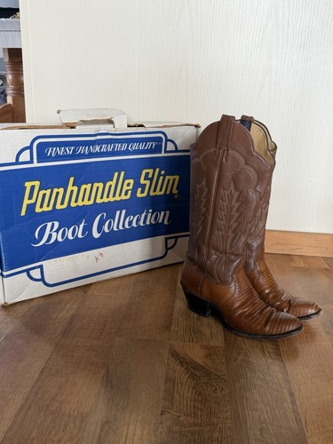 The lizard vamp adds beautiful natural texture and character that sets them apart from standard leather boots. • Genuine lizard leather vamp in “Nut” brown. • Leather shaft in “Honey” brown. Traditional snug western fit.