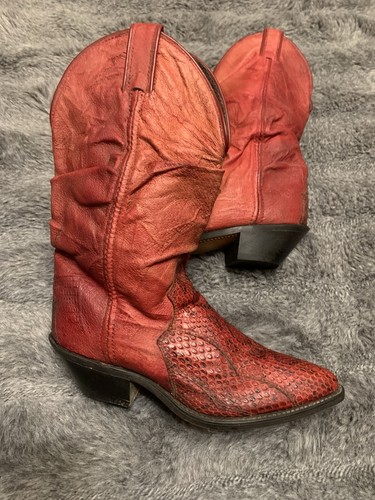 • Style: Western / Cowboy Boots. • Heel: Traditional Western heel. • Features: Embroidered Western stitching, pull tabs. Shows normal signs of wear consistent with age such as scuffs, creasing, and sole wear.