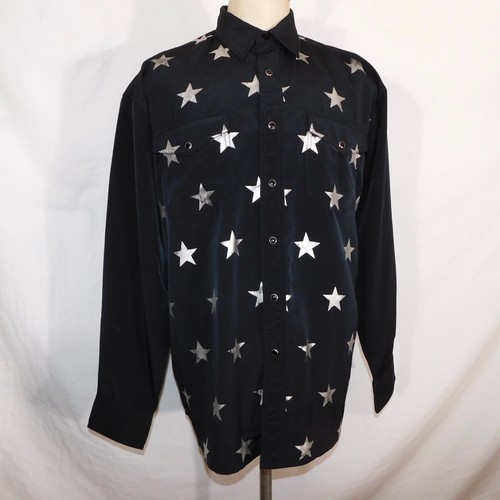 Vintage Mens L Black Western Shirt Silver Stars Pearl Snap Cowboy