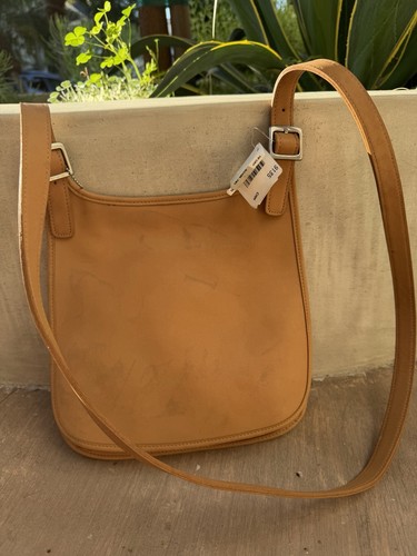 Vintage Coach 9135 Beige Leather Crossbody Shoulder Bag Old Coach USA New old stock but has some wear / stains /damage from storage - see photos. Main bag measures 10” x 10”. Strap is adjustable. Serial # DOP 9135