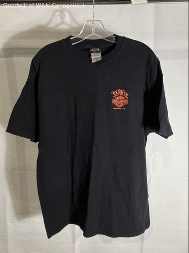 Yankee Bristol CT Dealer Graphic T-Shirt. This authentic Harley-Davidson dealer tee features classic graphics from Yankee Harley-Davidson in Bristol, Connecticut. The shirt showcases the iconic Bar & Shield logo in a vibrant orange and white colorway against a solid black cotton base.