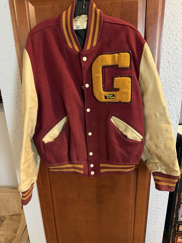 This Vintage Men’s Varsity Jacket in size 42 features a unique burgundy and gold color scheme with white leather sleeves, making it a standout piece for any wardrobe. The classic Varsity Jacket style and leather outer shell material give it a timeless and high-quality appeal, perfect for those who appreciate a blend of vintage charm and modern design. Perfect for men who want to make a statement with their fashion choices, this jacket is sure to turn heads and add a touch of sophistication to any outfit.