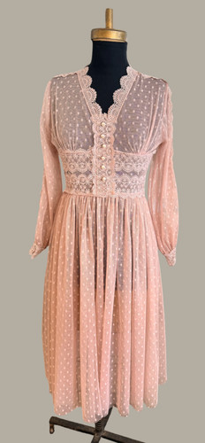 Beautiful dusty rose / blush pink tone with intricate lace bodice, pearl button accents, and sheer lace sleeves. • Prairie or bohemian weddings. • Sheer lace sleeves with lace trim. • Intricate lace waist panel.