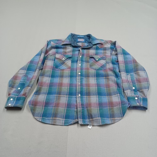 Vtg Shirt Mens Large Blue Purple Plaid Wool Made USA Pearl Snap 70's