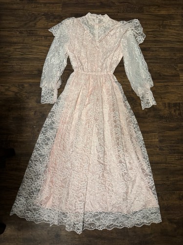 In good condition, but no size tag. Based on the measurements sz:Small. This vintage 1970s pink pastel lace dress exudes a romantic cottagecore prairie style, perfect for a special occasion. Made in the United States, this original piece is crafted from delicate lace material, giving it a Victorian look. The small size and regular fit make it a flattering and comfortable option for any woman wanting to channel the femininity of the 1970s era.