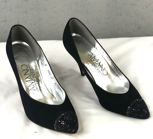 Brand: A'MANO (U-S-A by hand) Item: Womens dress shoes/pumps with pointed toe and beaded cap toe Color: Black with metallic silver footbeds Size: US 5 B (medium width) Materials: Textile upper; genuine leather outsole (stamped "GENUINE LEATHER") Features: Slip-on style, mid stiletto heel, elegant evening/cocktail design Insole/Style markings: 5 B | 1022 12 91 Era: Early 90s vintage based on interior code Notes: Classic timeless pumps; see photos for details and fit guidance.