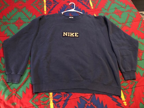 Vintage 90s Nike Sweatshirt Chenille Terrycloth Box Logo Patch Mens Size XL Blue.