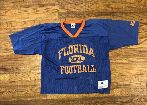 This jersey has some white spots on the bottom Measurements Pit to pit 24 in Length 24.5 in This product is a vintage 90's Starter University Florida Gators football mesh jersey in size XL. It is officially licensed and features the team's iconic blue color. Made in Korea, Republic of, this unisex adult jersey is perfect for fans looking to show their support for the Florida Gators during the regular season.