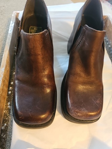 The product is a pair of vintage 1977 American Eagle Outfitters chunky platform shoes in size 9. These shoes are a nostalgic piece of women's footwear from the late 1970s, showcasing a retro style with a chunky platform design. The American Eagle brand adds a sense of authenticity and Americana to the shoes, making them a unique and stylish addition to any vintage clothing collection. Please notice the places on the heel of the shoes, it is very small but wanted to picture it.