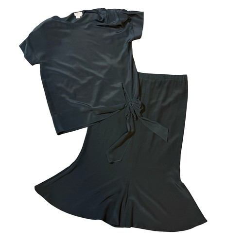Silkage New York two-piece set crafted from 100% silk in a timeless black hue. This elegant ensemble features a short-sleeve blouse with a sophisticated side-tie knot detail at the hem and shoulder pads. The matching midi-length skirt is designed with a comfortable elastic waistband and a graceful flared mermaid silhouette that offers beautiful movement. Perfect for formal events, evening wear, or elevated professional settings. Two small white spots as shown in photos. Measurements: • Blouse Pit to Pit: 22" (44" chest) • Blouse Length: 25" • Skirt Length: 33.5"