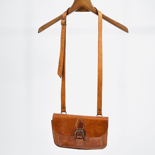 Genuine leather. Beautifully aged and rugged. Width 10”Height 8”Depth 3”Strap (adjustable) at shortest 21”.