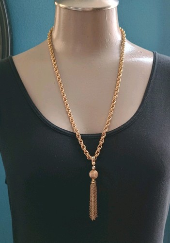 A signed Monet rope chain necklace approximately 24" in length. The necklace is in excellent vintage condition with a beautiful antique gold tone finish. It's a wonderfully retro chunky chain that can be worn with other pendants or on its own. The tassel is not signed and measures approximately 3.25". It is easily removable. Thanks for taking a look. Please reach out with any questions.