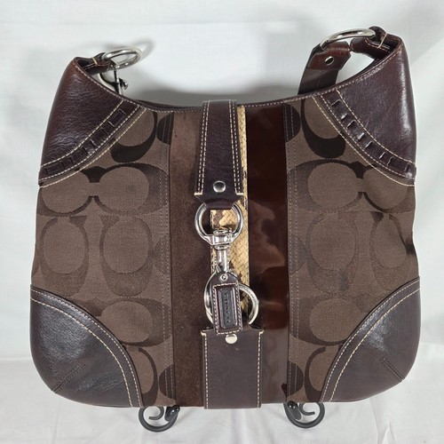 The COACH VTG #10260 Hampton Hobo Shoulder Bag is a stylish and versatile accessory perfect for various occasions, including travel, casual outings, work, and business meetings. This large rectangular bag features a signature canvas with a python print, suede, and leather accents, making it a unique and classic piece. The dark brown shoulder strap with silver hardware adds a touch of sophistication, while the striped pattern and logo accents give it a designer and limited edition feel. With inner pockets for organization, this vintage Coach bag exudes a timeless charm and quality craftsmanship that is sure to make a statement.