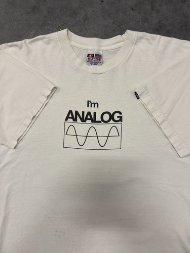 The product is a rare and obscure vintage 90s Pearl Jam t-shirt featuring the band during their I'm Analog tour. This extra large white tee is a unique piece of music memorabilia that captures the essence of the rock and pop genre. Made in the United States, this original piece is a must-have for any Pearl Jam fan or collector of bayside music memorabilia. With its retro appeal and unique design, this shirt is a standout piece that showcases the iconic band's influence on the music industry.