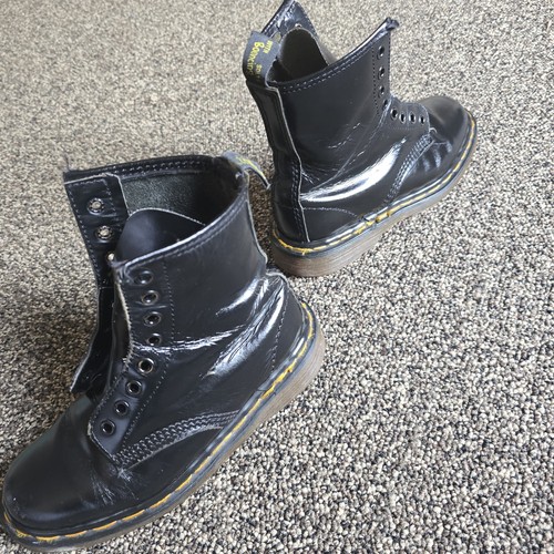 Internal Insole: 8 and one-half inches Outer Sole: 10 inches Classic 8-eyelet black leather. The leather has that natural, lived-in creasing and some scuffs on the toes from age, but no deep cracks or holes. Everything is solid—the eyelets are secure, the heel loops are still there, and the air-cushioned soles have plenty of tread left, just a bit of wear at the heels. Cleaned up and ready to wear. There is no size marked inside, so don't guess. Using a tape measure inside from the very tip to the heel, it’s exactly 8 and one-half inches. These are boots only with new shoestrings, not original shoestrings, there is no box. Review the photos before purchasing message me with questions and or for more photos.
