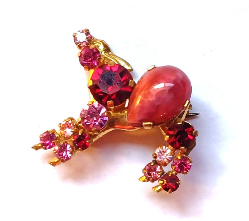 This vintage Deer brooch Made in Austria is in good condition with a spot of wear on the back. It has red and pink rhinestones with a pink swirl Cabochon. This brooch measures approx. 1" long and 1 1/4" wide and is sign Made Austria.