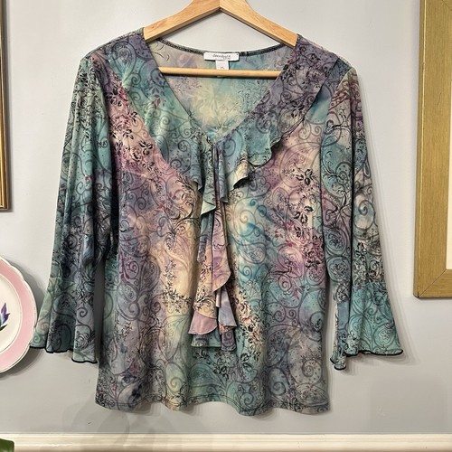 Vintage ruffled blouse with pastel swirl design. Features ruffle sleeves, a v-neckline and soft stretchy material. Size petite large, see photos for exact measurements. Excellent condition.