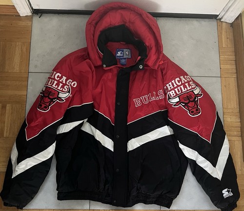 Vintage 90s Chicago Bulls NBA Starter Full Zip Puffer Hooded Jacket Size XL Pit to pit 30”, long 29” In very good condition