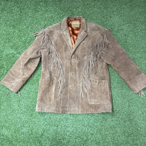 The Zeidler & Zeidler Brown Suede Leather Fringe Jacket is a vintage western-inspired piece designed for men in XL size. Made from leather with a button closure, this mid-length overcoat features fringe accents, lined interior, collared neckline, and pockets. Perfect for casual occasions in winter, fall, or spring, this jacket is a stylish addition to any wardrobe with its classic western theme. Made in China, this jacket is a timeless piece that can be dressed up or down for a variety of looks.