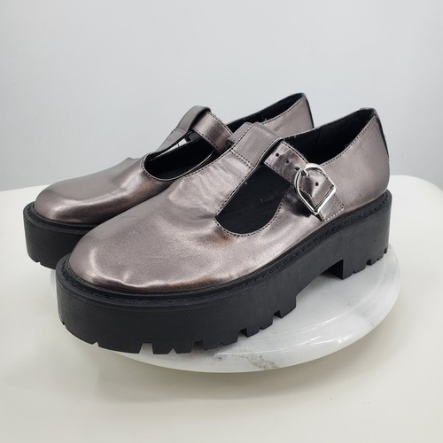 Metallic gunmetal T-strap Mary Janes from Mix No. 6 feature a bold, chunky lug sole for a modern edge. These Corah platform shoes are designed with a sleek faux leather upper and a secure buckle closure, making them a versatile choice for adding a touch of industrial style to any outfit. The heavy tread provides both height and stability, perfect for all-day wear. Keywords: Grunge, Goth, Punk, Cyberpunk, Industrial, Y2K, 90s Style, Alternative, Chunky Shoes, Metallic, Dark Academia, Streetwear, Edgy, Bratz, Platform Loafers