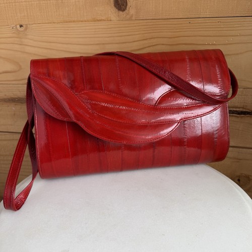 Vintage Genuine Red Eel Skin Satchel Handbag Made in Korea Shoulder Bag 12x7 80s There’s a scrape under the flap shown in close up photo. Very good preowned condition!