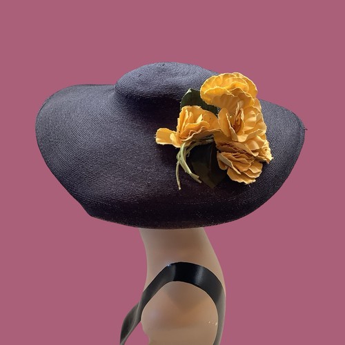 This is a stunning hat in excellent condition for its age it is a black straw wide brim with chin strap and beautiful yellow floral pin. It measures 18” across. The inner band has come loose and was pinned in place with safety pins but can easily be repaired.