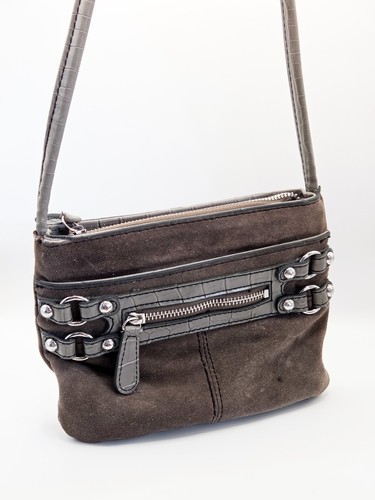 Authentic Etienne Aigner small crossbody bag in rich dark brown suede with gray croc-embossed faux leather trim, silver-tone stud and ring hardware, and a long adjustable shoulder strap. Features a zip-top closure, front zip pocket with croc-trim detailing, striped fabric interior lining, and a detachable ID card holder with clear window.