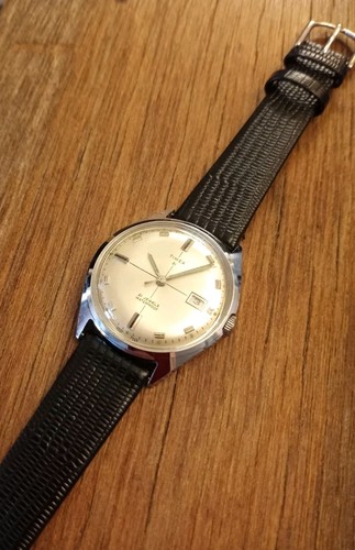 Better known as the Cross Hair this Beautiful piece offers Timex Best 21 Jewels hand winding mechanical movement that has been Professionally Serviced and keeping time as new with a 42 hour power reserve with a full winding! Silver metallic dial with chrome plated markers and hands. Date window at 3 o'clock. A Brand New black genuine lizard calf strap has also been installed that really makes this piece look great with incrediblecomfort! Thanks for looking. Fast Free Shipping!