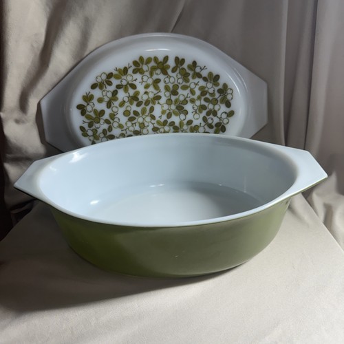 The Vintage Pyrex 045 Oval Casserole Dish with Lid in Verde is a stylish and retro piece of dinnerware that boasts a classic mid-century modern design. This 2.5 qt. covered dish features a glossy green finish with a floral theme, making it both functional and decorative. Made in the United States, this original Pyrex casserole dish is microwave safe and crafted from durable glass with handles for easy transportation. Perfect for serving and storing a variety of dishes, this vintage piece adds a touch of nostalgia to any kitchen.