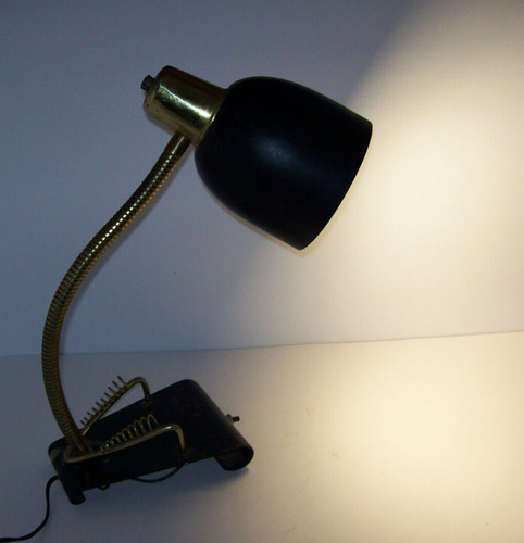 WORKS GREAT! Has a switch on the bottom base area to turn on or off. Uses a standard size light bulb, not included. 16" Tall (adjustable with gooseneck.). 7" Long x 5-1/8" Wide. Lamp is in PRE-OWNED, WORKING condition.