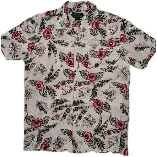 The Vintage Pendelton Hawaiian Button Up Shirt for men in size M is a colorful and vibrant addition to any wardrobe. This short sleeve shirt features a traditional collared neckline and button closure, with a unique floral Hawaiian theme that adds a touch of retro style. The Pendleton brand is known for its quality and craftsmanship, making this shirt a reliable and stylish choice for casual occasions.
