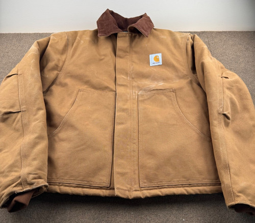The Vintage Carhartt J02BRN JQ186 Arctic Quilt Lined Jacket in Men's Size 40 is a classic piece of American workwear. Made of durable cotton canvas with a polyester lining, it features a zip closure, pockets, and Carhartt's iconic logo. With a solid brown color and a vintage vibe, this jacket is perfect for casual or workwear occasions in the colder seasons. Handmade in the USA, this chore coat offers a regular fit and is machine washable for easy care. Perfect for those who appreciate quality craftsmanship and timeless style.