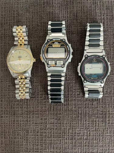 Lot of 3 vintage men's Timex watches: 1) Timex Atlantis features quartz movement, water resistant, stop watch. 2) Timex Ironman Triathlon with a silver case and black and silver bracelet is water resistant with a memory stopwatch. 3) Timex Indiglo Two-Tone Presidentail Day-Date featuring quartz movement, water resistant, stainless steel bracelet with clasp. Untested. All need a battery.