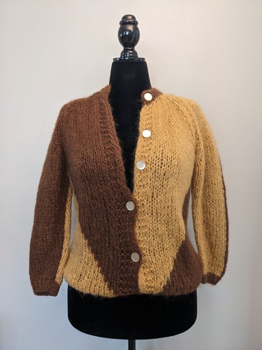 The Tam Italia Vintage Mohair Wool Sweater is a stylish and cozy addition to any woman's wardrobe. This yellow & brown sweater features a round neck, long sleeves, and button accents, giving it a classic and timeless look. Made from a luxurious blend of mohair, wool, and nylon this sweater must be dry cleaned. With a vintage appeal and the reputable brand of Tam Italia, this sweater is a versatile and chic choice for any occasion. 18" Armpit-to-Armpit when laid flat