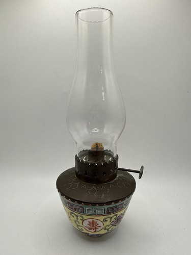 Wick is present. You’re buying item as is in picture. The porcelain base is beautifully decorated with traditional motifs and symbols, adding strong visual appeal whether displayed or used. The base is marked “W.L. Decorated in Hong Kong,” placing it in the mid-to-late 20th century export era when decorative Asian-inspired pieces were produced for the global market.