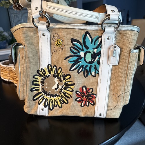 The Vtg COACH Y2k Bee Floral Shoulder Tote Turnlock Motif Bag from 2005 is a limited edition large tote bag with a unique burlap exterior and silver hardware accents. The bag showcases embroidered floral patterns with a bee motif, rhinestone accents, and the iconic Coach logo, making it a stylish and eye-catching accessory for any outfit.