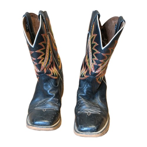 Classic black leather foot with colorful embroidered shaft. Good pre-owned condition with normal signs of wear from use. Boots have been worn but remain structurally solid with plenty of life left. Genuine leather construction.