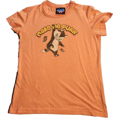 Junk Food Clothing t-shirt features a vintage-inspired graphic of cat with the playful text "Make Me Purr." Crafted from a soft cotton-poly blend in a heathered orange hue, this short-sleeve crewneck tee offers a slim, retro fit. The front graphic includes charming butterfly details and a distressed finish for an authentic throwback aesthetic. Made in the USA. Measurements: • Pit to Pit: 17" • Length: 23" 265 000 041626