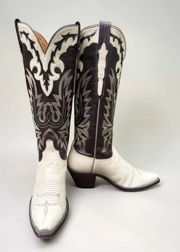 Maker: Lucchese. Era: 1980s. Leather soles with traditional pegged construction. Tall shaft profile with scalloped topline. Classic western heel with a sharp, feminine toe.