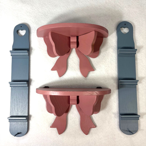 Unused Excellent condition. 2 narrow vertical hanging country blue mini shelves with cut-out heart at the top. 1989 Tender Heart Treasures, LTD (Taiwan). 2 horizontal hanging dusty pink small shelves with bow design.