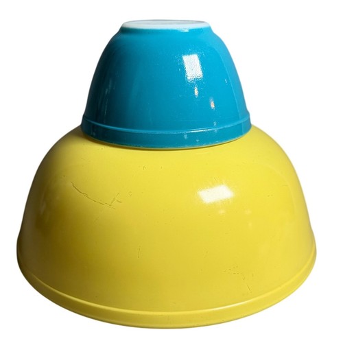 Vintage Pyrex primary colors mixing bowl set includes the large 4-quart yellow bowl (404) and the small 1.5-pint blue bowl (401). These classic mid-century modern nesting bowls are crafted from durable milk glass with a vibrant fired-on exterior finish. Perfect for mixing, serving, or displaying in a retro-themed kitchen, these iconic pieces represent timeless American kitchenware design. Both bowls show signs of use including surface scratches and minor finish wear consistent with age. Measurements: • Yellow Bowl (404): 4qt Capacity • Blue Bowl (401): 1 1/2pt Capacity