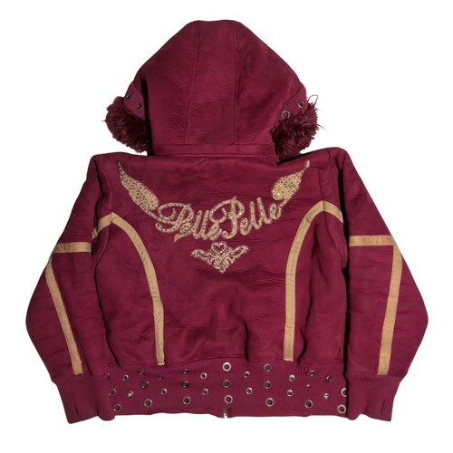 Vintage Pelle Pelle Leather Jacket Womens Size XL Bomber Studded Y2K Faux Fur. There's some blemishes throughout the jacket as pictured. Pilling on the sleeve cuffs and the hem. One of the studs on the hem is coming undone from the fabric and there's a small hole in the chest pocket. In fair overall condition. Angel wings