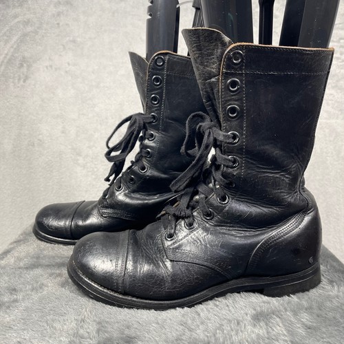 Vintage military-style combat boots crafted from black leather with a classic cap toe design and high-top lace-up silhouette. These weathered boots feature a rugged aesthetic with original Pan-Co rubber soles. Please note the leather shows significant wear, including gouges and a heavily distressed texture. The interior will require an insole or repair as shoe tacks are beginning to surface through the footbed. Ideal for restoration or as a prop piece for a specific aged look. Keywords: Combat Boots, Military Style, Cap Toe, Distressed Leather, Vintage Aesthetic, Punk, Grunge, Goth, Biker, Workwear, Restoration Project, Weathered, Biltrite, Pan-Co, High Top please verify size to ensure proper fit fair condition, see photos for condition details